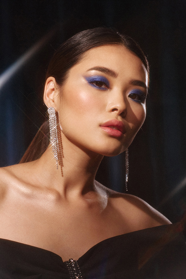 Глаза — классика с твистом: смоки в тёплых коричнево-шоколадных тонах или графичная стрелка (асимметричная или с негативным пространством — тренд не уходит). Не стесняйтесь ярких оттенков, те же синие или красные. Вечерний макияж глаз можно без зазрений совести разбавить сиянием. Добавьте немного глиттера во внутренний уголок или на центр подвижного века — взгляд заиграет при свечах.